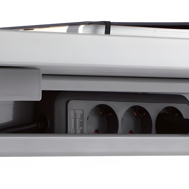 Kabelkanal bereits in der Traverse integriert, dient der sauberen Verlegung von Kabeln und Steckdosen. Zuführung optional über Kabelspirale.
